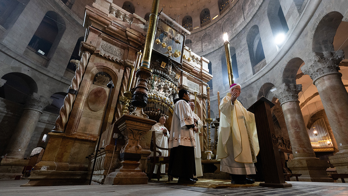 Bishop Jim Curry celebrates Solemn Mass at the tomb of Jesus Christ in the Church of the Holy Sepulchre with Bishop Nicholas Hudson, the Bishop of Plymouth and Moderator of the Holy Land Co-ordination, and 11 other Bishops from around the world. The Mass took place on Wednesday, 21 January 2026.