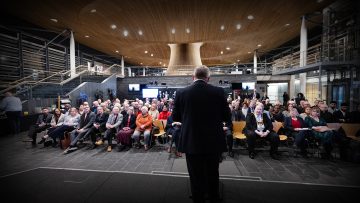 Daeth y trobwynt, a seliodd yr ymweliad fel llwyddiant cenedlaethol, ar yr ail ddiwrnod: anerchiad y Pab i gynrychiolwyr y gymdeithas, yn cynnwys seneddwyr, a hynny o dan drawstiau hynafol Neuadd San Steffan. Siaradodd am ‘ran gyfreithlon crefydd yn y sgwâr cyhoeddus’, a gwrandawyd arno. Pwysodd ar y syniad ‘y gall yr Eglwys a’r awdurdodau cyhoeddus gydweithio er lles dinasyddion,’ a chafodd ei gymeradwyo gan David Cameron, y Prif Weinidog, a’i ragflaenwyr, Gordon Brown, Tony Blair, John Major, a Margaret Thatcher. Derbyniodd y Pab gymeradwyaeth hynod a chododd y gynulleidfa ar eu traed wrth iddo gerdded i lawr hyd eithaf y neuadd.